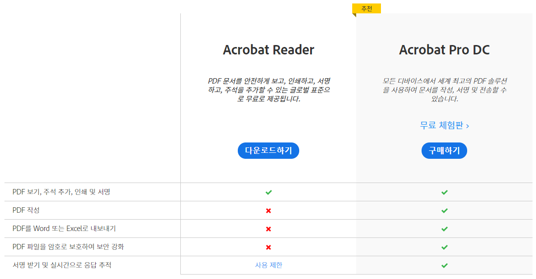 Acrobat Reader 무료 버전에서는 PDF작성, Word 또는 Excel로 내보내기, 암호로 보호하여 보안강화 기능을 사용할 수 없습니다. Acrobat Reader Pro DC 유료버전은 모든 기능을 사용할 수 있습니다.