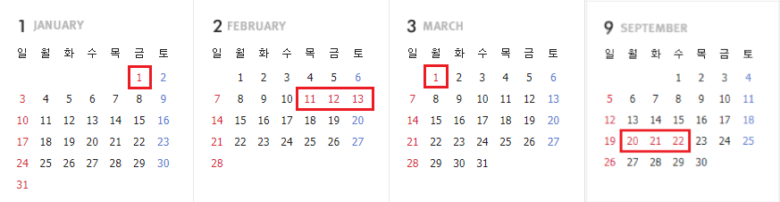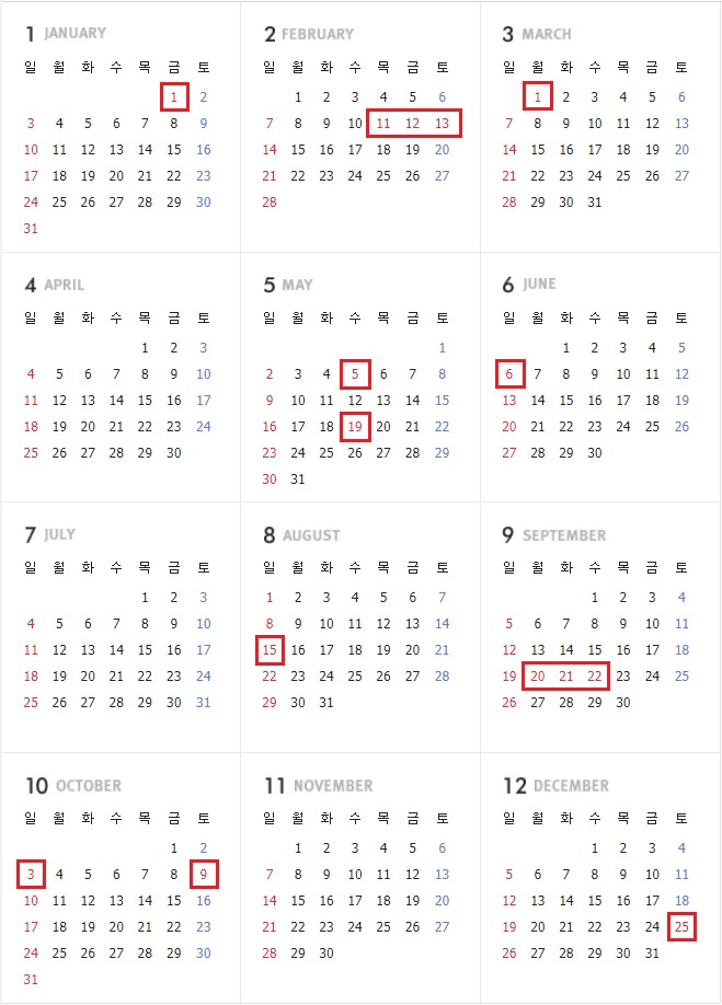 토요일 일요일도 국경일이면 표시해놨습니다.