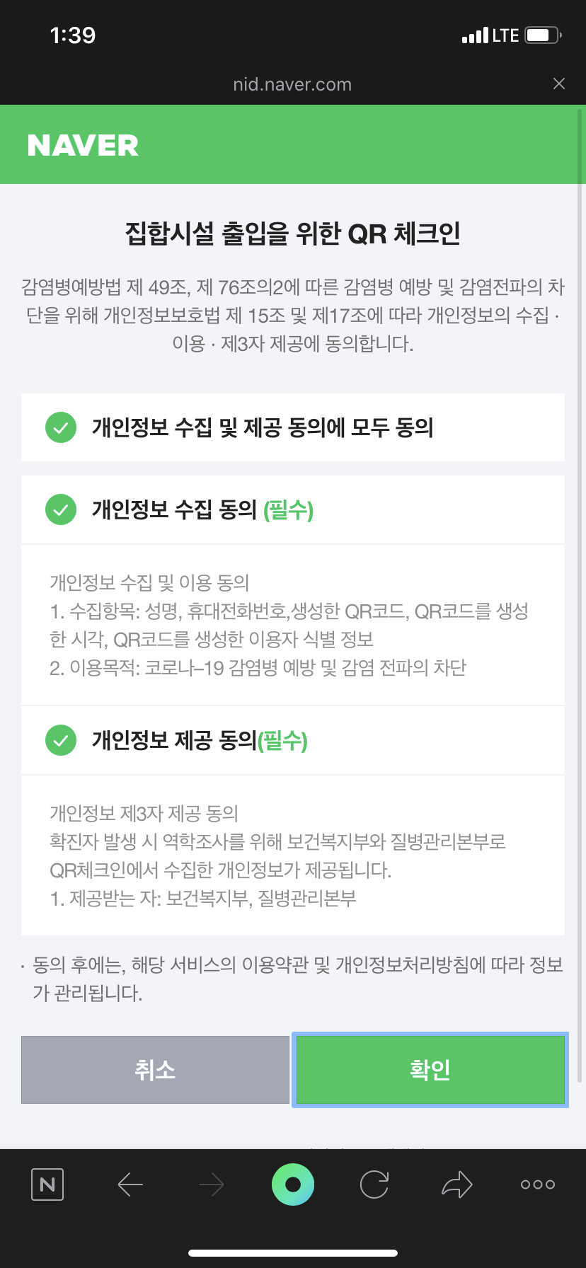 모두 동의 후 확인을 누르시기 바랍니다.