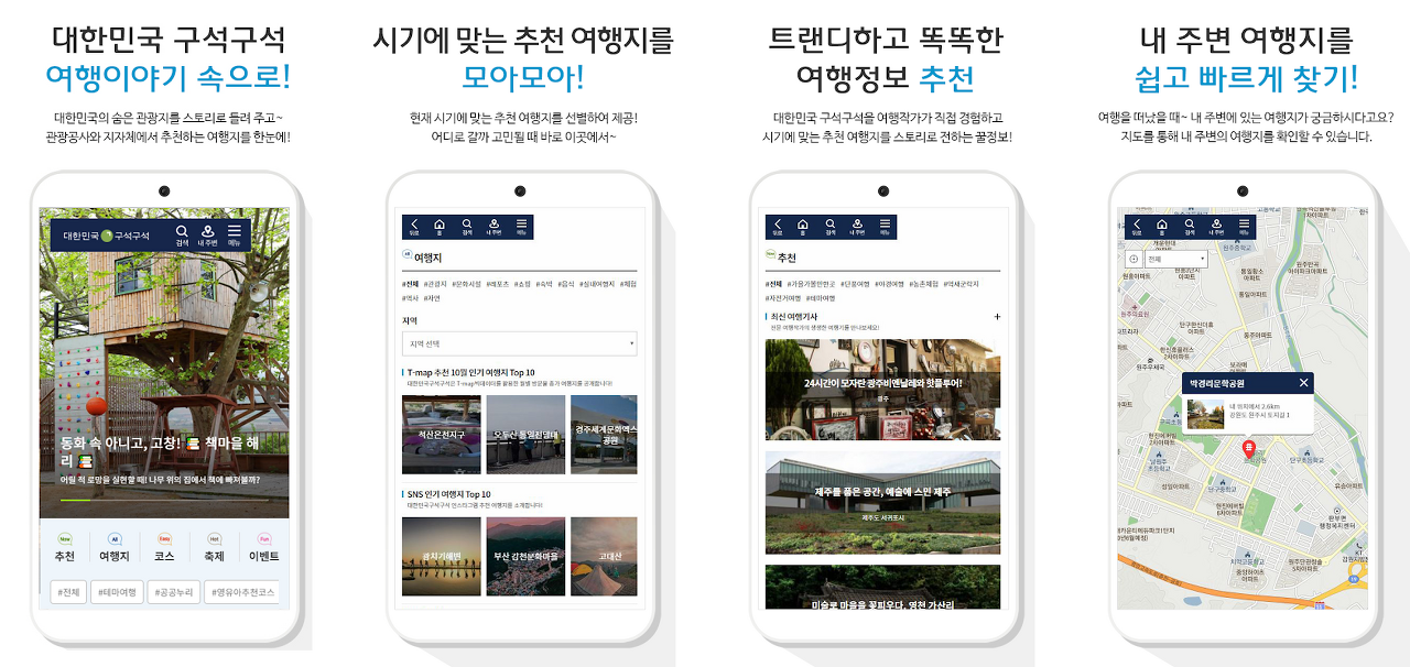 - 사용자 위치를 기준으로 관광지, 음식, 숙박, 축제/행사 등의 여행정보 제공 및 내비게이션/지도/길안내 서비스