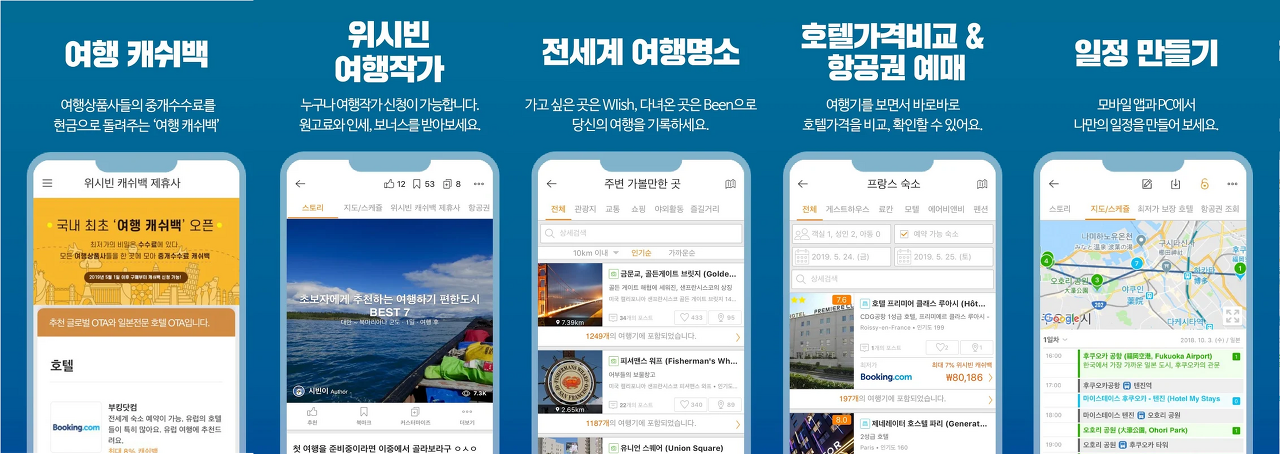 특이하게 '여행 캐쉬백'이란것을 운영하여, 등록된 제휴사에서 여행상품을 구매할 경우 중개수수료 중 일정 %를 돌려받아 사용 가능하게 합니다. 등록된 제휴사는 아고다 호텔, 와그, 클룩 투어액티비티, 여행자보험 등 다양합니다. 자신이 여행블로거라면 위시빈 앱을 사용해서 여행작가가 될 수 있고, 이로 인해 수익도 발생시킬 수 있습니다. 구글 플레이 사이트 또는 앱 스토어에서 다운이 가능합니다.