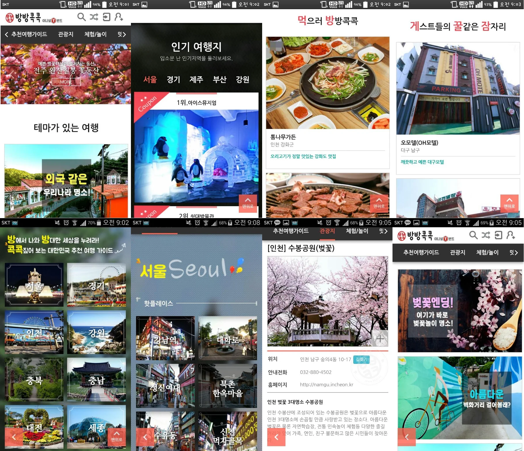 방방콕콕은 대한민국의 관광지와, 관광지 주변의 맛집 또 숙수와 축제정보까지 모든 정보를 알려주는 앱, 사이트입니다. 이 어플은 사용자편의를 위해 가독성이 좋게 디자인된 것을 확인할 수 있으며, 여행매니아들이 사용하는 어플인 만큼 관광지 주변의 맛집들을 검색해줍니다. 구글 플레이 사이트 또는 앱 스토어에서 다운이 가능합니다.