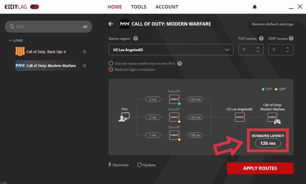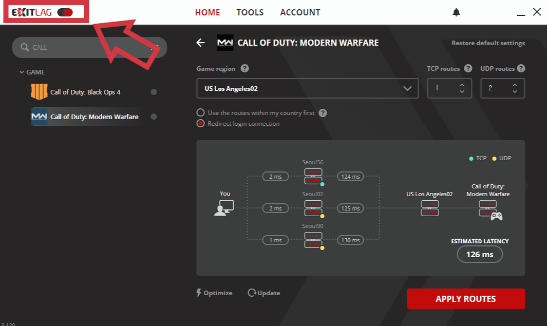 Вы можете легко выключить / включить ExitLag, нажав на красное поле выше.