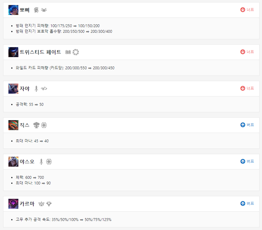 뽀삐, 트위스티드 페이트, 자야, 케일은 스킬과 공격력에서 너프를 당했고,
