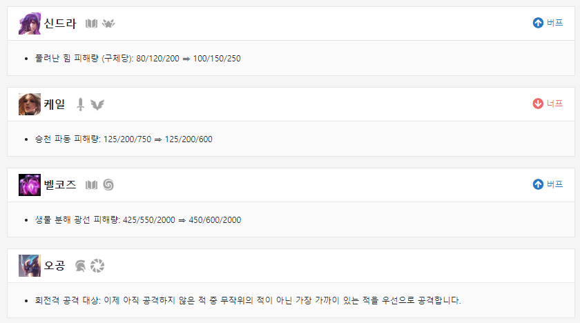 직스, 야스오, 카르마, 신드라, 벨코즈는 소폭 버프를 받았네요.