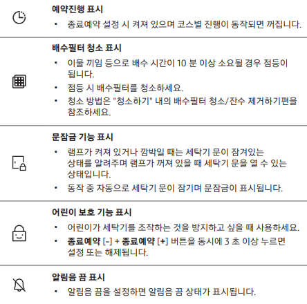 | dC | 세탁기 문 열림 | 세탁기 문 닫은 후 [동작/일시정지] 버튼 눌러 재작동 |